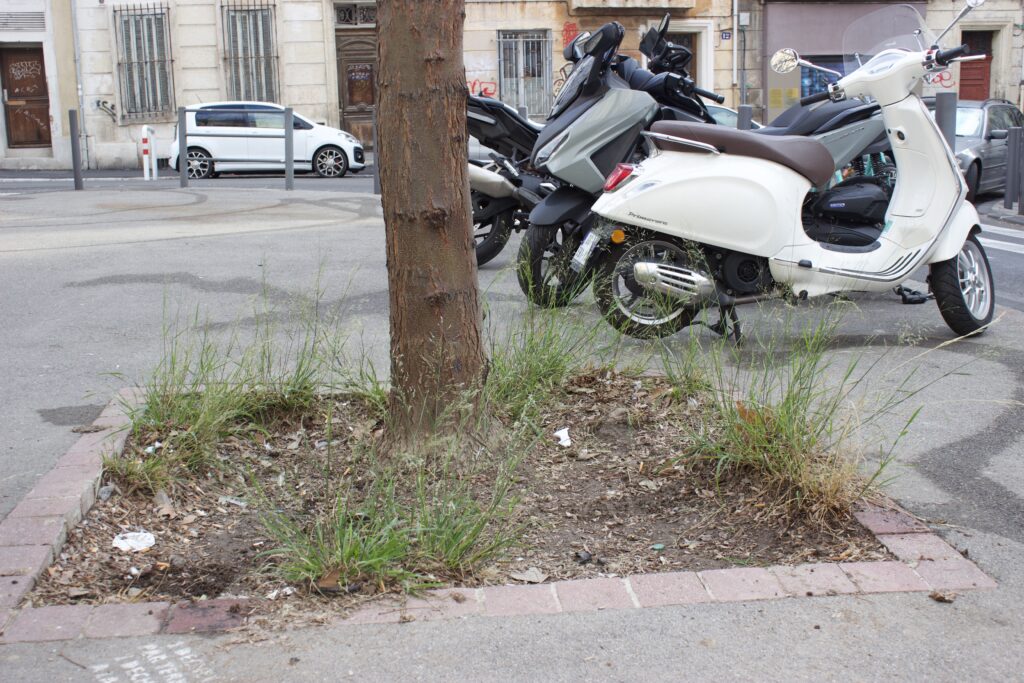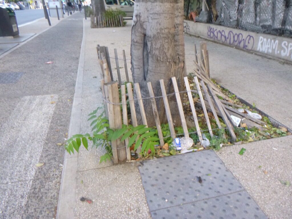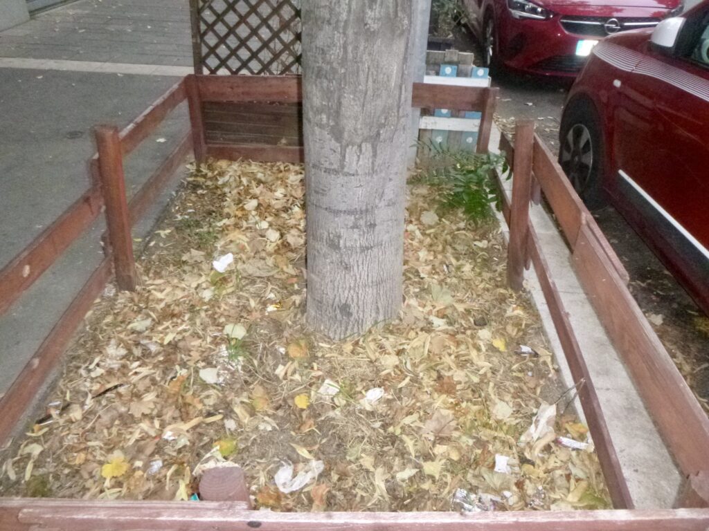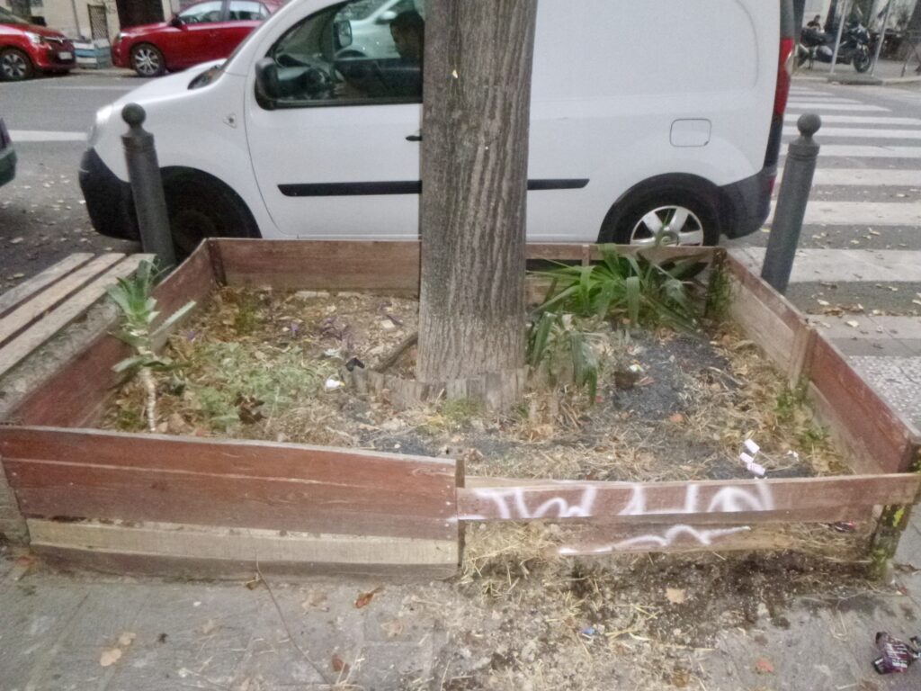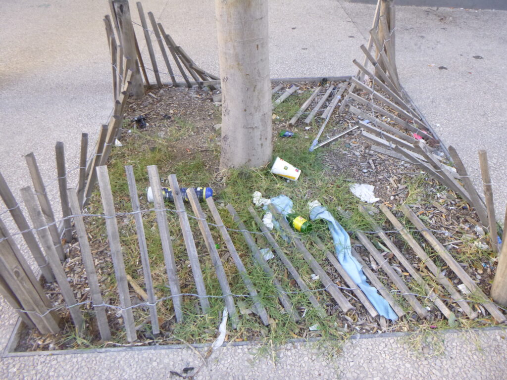 Je nettoie régulièrement, mais l’espace public est peu respecté. Planter et entretenir des couvre-sols sous les arbres, vu ces comportements anti-sociaux si ancrés et incontestés, serait une perte d’efforts. Si on regarde par exemple les plantations récentes devant la Gare de la Blancarde, à la Place Charles de Gaulle et à la Place Jean Jaurès, on remarque qu’on permet aux chiens et aux enfants de franchir les barrières pour tout piétiner, qu’on a arraché et cassé beaucoup de plantes, et qu’on salit constamment.