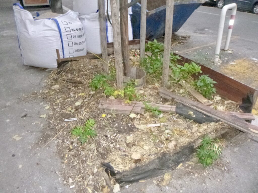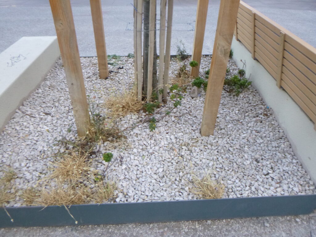Pendant plusieurs mois les cantonniers, avec leur centre à dix mètres, n’ont rien fait. Il y a deux semaines je me suis occupé de nettoyer et de désherber. Suspectant qu’il devait y avoir du béton sous la surface car après la pluie l’eau s’infiltrait très lentement et l’arbre avait été planté bien excentré, je me suis mis à explorer. J’ai trouvé que sous quelques centimètres de terre il y avait une bonne épaisseur de béton que les jardiniers qui avaient planté l’arbre avaient laissée, ce béton caché couvrant la moitié du carré. Voulant que l’arbre pousse bien, j’ai passé deux heures à casser ce béton, enlevant dix seaux.