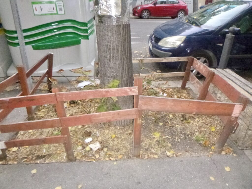 Il faut aussi préciser que c’était grâce à la négligence de la ville que les armes employées ont été fournies: les tuteurs d’arbres en bois, (sans attaches, qui ne servaient plus à rien depuis des années, les arbres étant déjà grands), ont été laissés à pourrir en terre plutôt qu’être enlevés. Pas très joli! C’était une invitation aux délinquants à les convertir en battes. Il est probable que je vais finir par enlever moi-même les tuteurs et les grillages autour de certains arbres qui commencent à bien serrer les troncs, menaçant de couper le cambium.