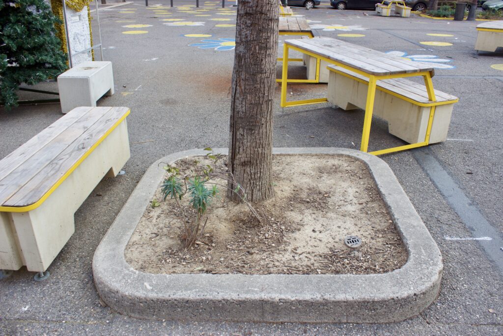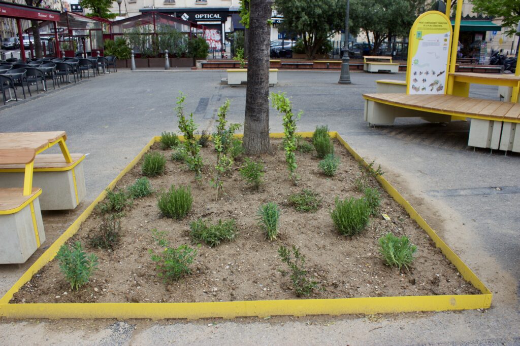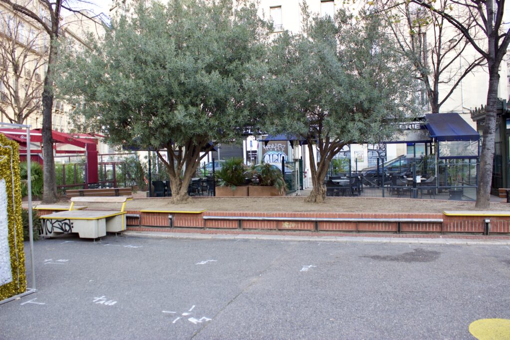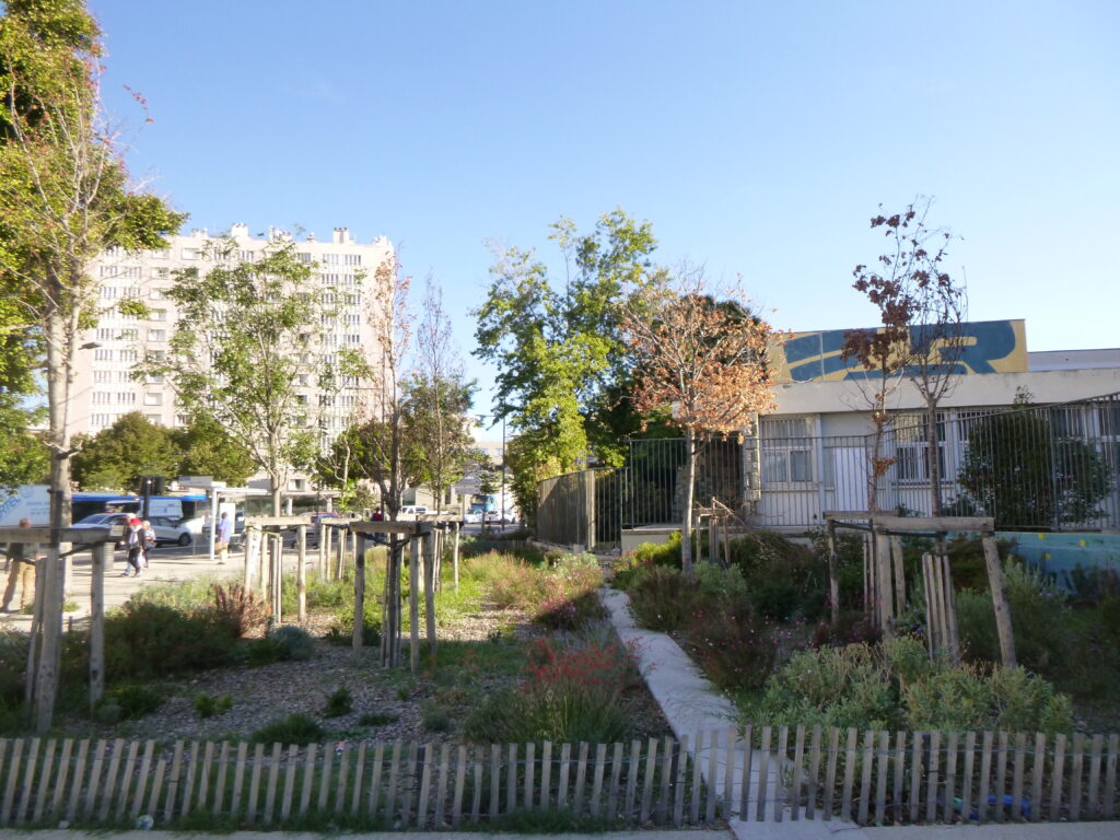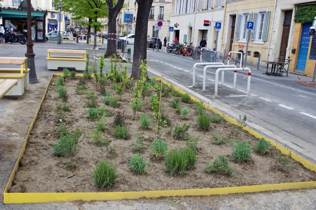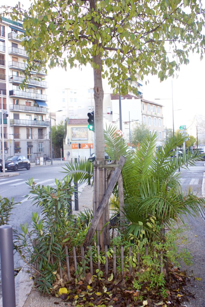 À Marseille, les considérations mentionnées précédemment sont moins prioritaires que l’obtention de résultats rapides. Et face à l’atténuation des températures dans le contexte d’un îlot de chaleur urbain, la priorité est désormais donnée à une plantation dense afin de maximiser le couvert végétal et de réduire le réchauffement dû au rayonnement solaire. Cependant, étant donné que l’augmentation de la densité des arbres peut entraîner une augmentation du nombre d’arbres en mauvaise santé, qui sont des thermorégulateurs moins efficaces en raison d’un feuillage plus clairsemé et d’un refroidissement par transpiration foliaire réduit, l’augmentation marginale de la canopée globale pourrait même être contre-productive pour l’atténuation de la température.