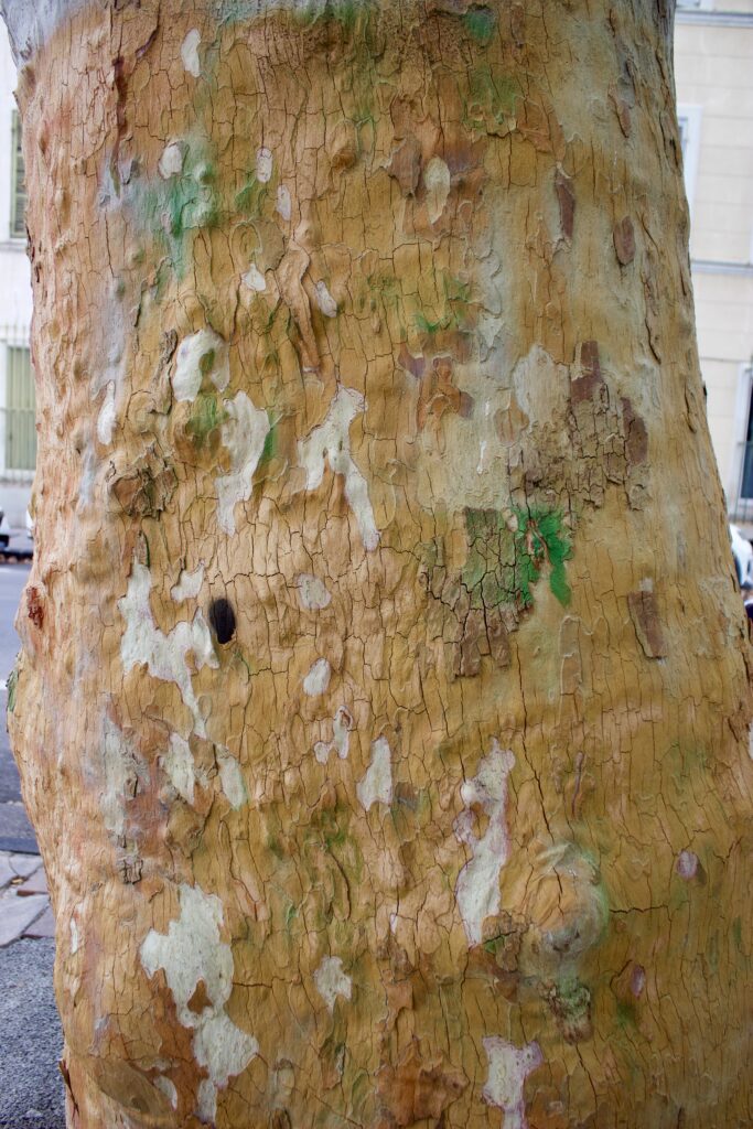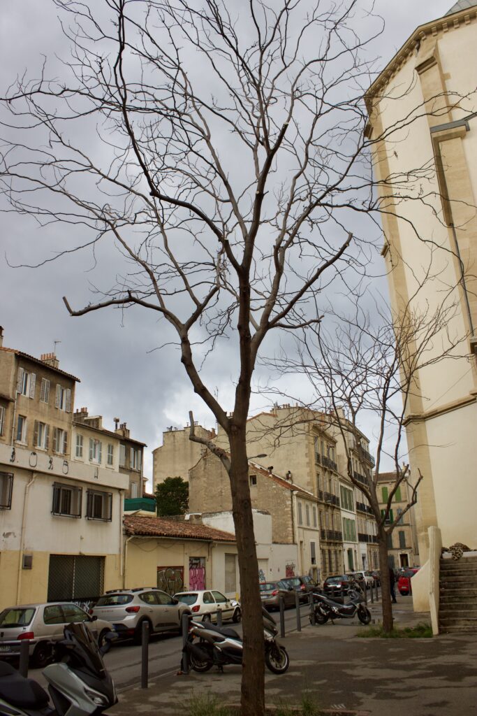 En plus d’être totalement déformé par l’amputation de ses branches, cet arbre présente un autre aspect artificiel, ce qui est courant dans les nouveaux paysages de Marseille en raison de la plantation de spécimens d’arbres initialement très grands, qui sont mal placés dans des espaces confinés, sous des arbres matures, trop près d’autres arbres, de bâtiments, etc.. Dans de telles situations, l’arbre nouvellement planté, avec un tronc droit et vertical, s’adapte à son nouvel environnement en poussant vers l’extérieur, en s’inclinant à un angle important à la recherche de lumière, ce qui entraîne une courbure prononcée et artificielle du tronc à 3 ou 4 mètres de hauteur. Un argument, parmi beaucoup d’autres, en faveur de la plantation d’arbres plus petits.