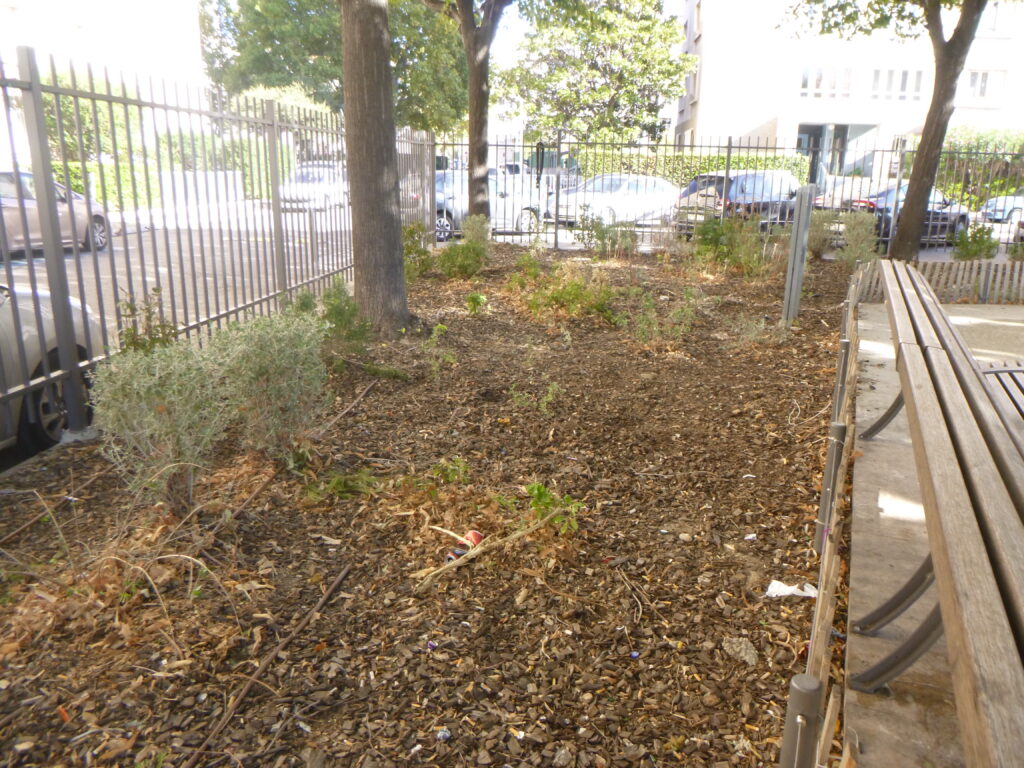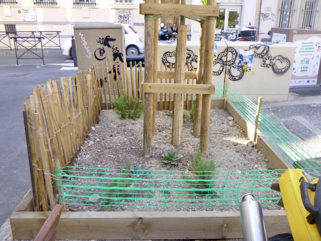 Addendum 1 Depuis l’écriture de mon récit, j’ai enlevé les tuteurs et les grillages autour des quatre arbres du côté de la rue du Camas. Ça serait bien de planter des couvre-sols appropriés en bas des arbres – pas comme on vient de faire à la Place Jean Jaurès: des chênes kermès trop grands (1-3m) et très piquants à côté des bancs, des myrtes tarentines trop grandes (2-3m), ou des cistes trop fragiles et de courte vie. Quelle ineptie et quel gaspillage d’argent! Si j’avais des alliés, et l’autorisation de la ville, je planterais des couvre-sols avec des barrières, et ferais l’entretien après.