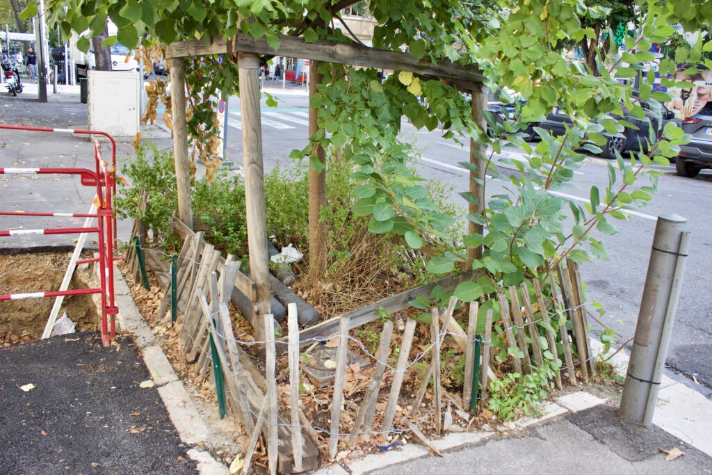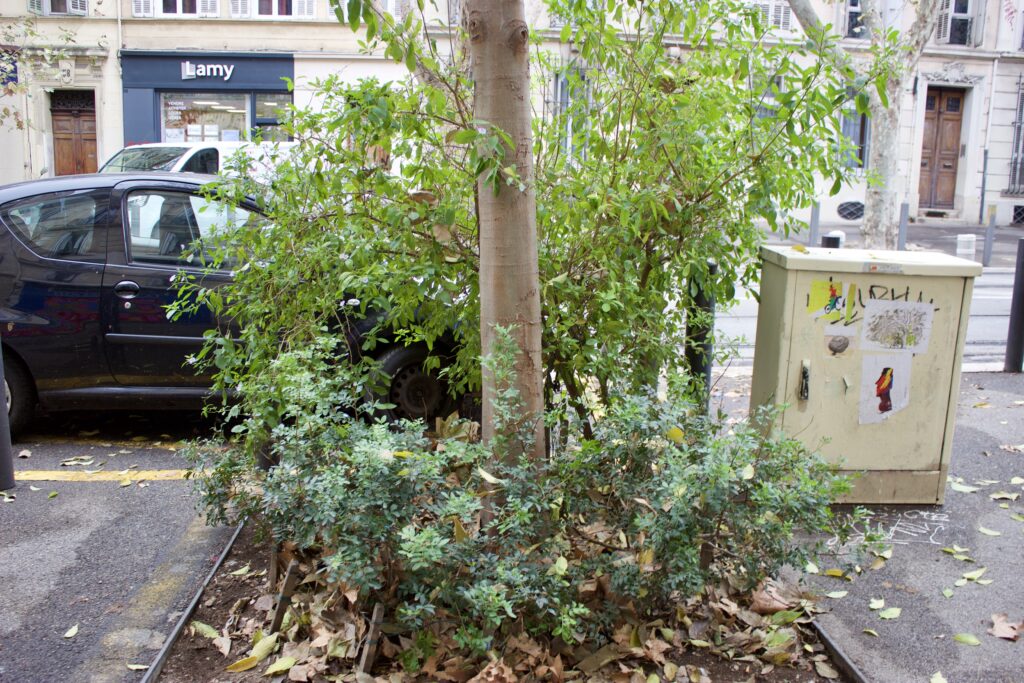 La seul aménagement paysager de fosses arborées planifié et entretenu par des habitants à Marseille que je peux apprécier dans une certaine mesure se trouve sur le boulevard Chave, juste un peu à l’ouest du boulevard Eugène Pierre. Créé par le professeur de musique de l’Espace Moz’Art, il lutte depuis plusieurs années pour protéger trois puits d’arbres paysagers contre le mépris local pour les espaces verts.
