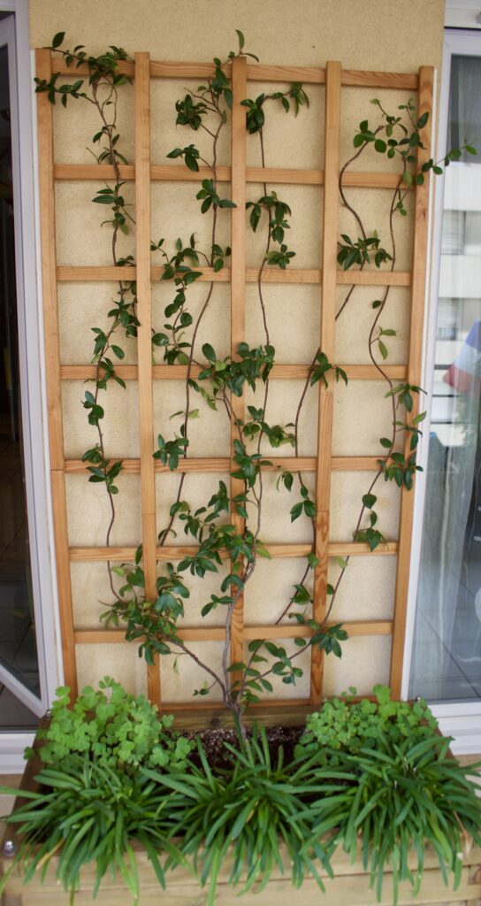 Je viens de planter un jasmin étoilé chez moi dans un pot au bord d’une fenêtre, dressé non pas pour grimper, mais pour tomber en cascade le long du mur, pour compléter le romarin en cascade, Salvia rosmarinus ‘Repens’ dans la fenêtre adjacente.