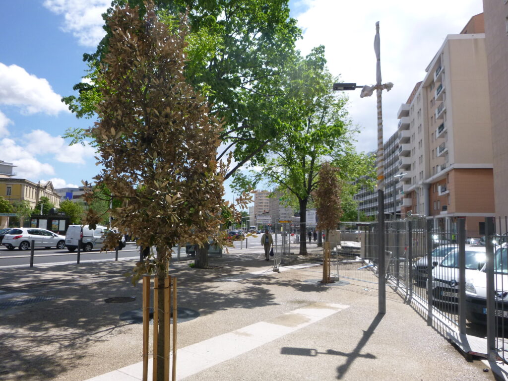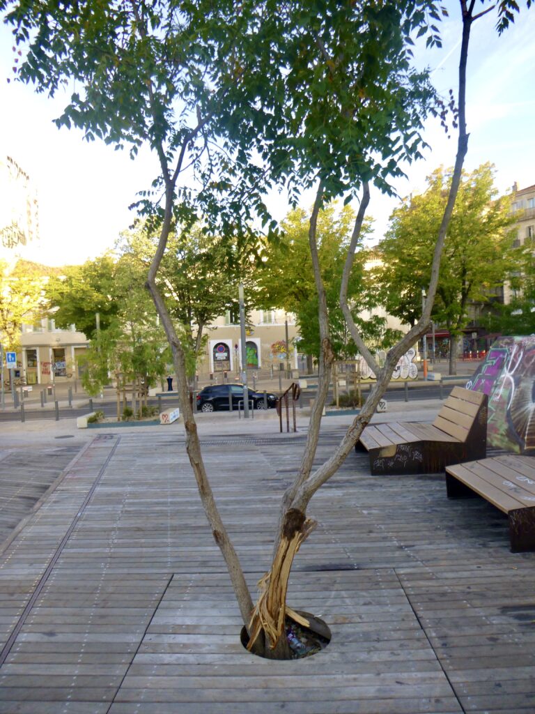 Voir mon étude “Les Magnolia grandiflora à Marseille” dans laquelle j’examine le triste sort de ces arbres ainsi que la rénovation de la place. Photo: 14 août 2023.