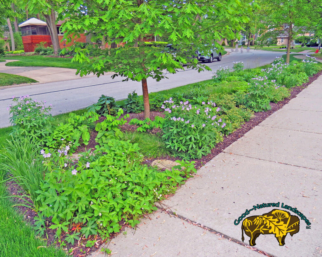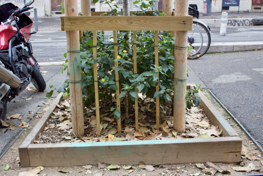 Peut-être pour décourager les gens de traverser les puits d’arbres, de nouveaux arbres sont souvent plantés dans des lits surélevés avec des bordures en bois primitives qui semblent temporaires. Après plusieurs années, le bois se décomposera et les planches disparaîtront. Le sol qui n’est plus contenu va s’éroder sur les côtés et des pentes vont se développer. L’eau de pluie, surtout lors de fortes averses, au lieu de s’infiltrer dans le sol, sera perdue en grande partie et ruissellera sur le trottoir et la rue. Tant de choses me laissent perplexe lorsque j’analyse les pratiques horticoles d’ici.