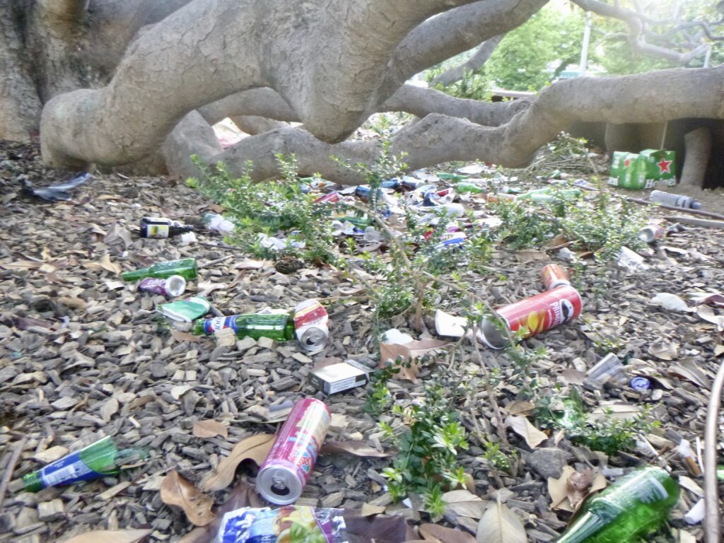 Malgré mes exhortations à répétition aux propriétaires de chiens, qui pensent avoir le droit de laisser déféquer leurs chiens sur la terre autour les arbres, et également aux ivrognes qui font la fête et jettent leurs capsules de Heineken, leurs mégots, et parfois leurs bouteilles (verre cassé) partout, rien ne change.