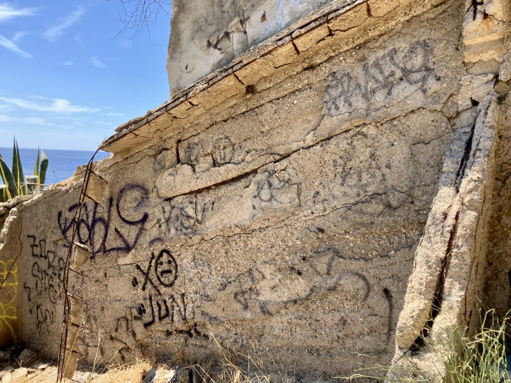 Les seuls graffitis restants sur les plages entre Les Anthénors et Les Figuières se trouvent le long des marches descendant vers la plage naturiste, sur le mur de béton en bordure de la propriété d’Étienne Amic. Il m’a exprimé son intention de recouvrir le mur d’une façade en pierre ou en stuc. La pierre se fondrait mieux dans les falaises rocheuses environnantes.