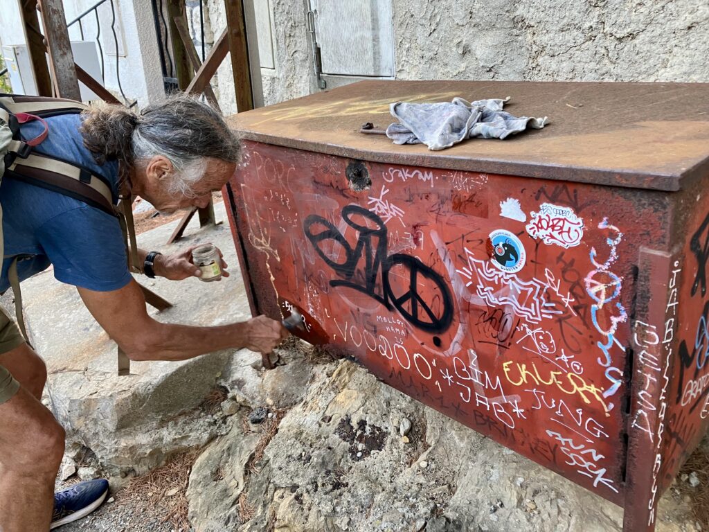 Comme la ville n’était pas intervenue dans le vallon des Anthénors et qu’elle ne le ferait probablement pas, j’ai décidé d’entreprendre moi-même l’éradication des graffitis. L’élimination chimique était nécessaire. J’ai d’abord utilisé un solvant en bombe aérosol qui était trop cher, puis, après recherche et expérimentation, j’ai utilisé plusieurs bouteilles d’un substitut de l’acétone en plus de mes outils en métal quand approprié.