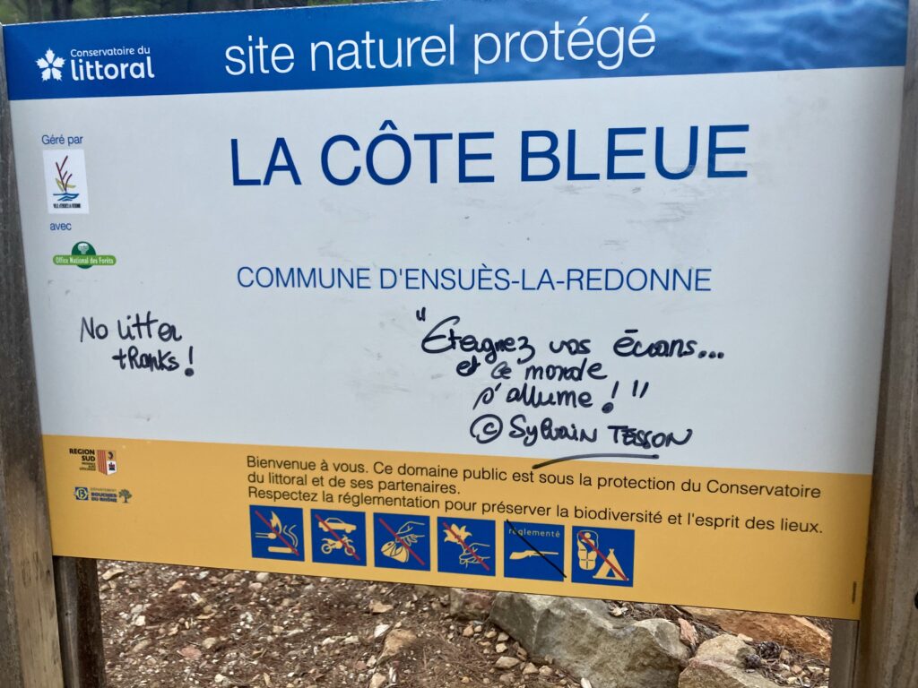 Mon travail sur le sentier est relaté en détail dans le long article ; Sur la Côte Bleue, un immigrant ose améliorer l’espace public qui manque d’entretien. Deux articles complémentaires illustrent les mesures de contrôle utilisées ailleurs, des barrières et des pancartes: Protection de la nature le long des sentiers en France et en Italie et Protection de la nature le long des sentiers dans l’ouest des Etats-Unis.